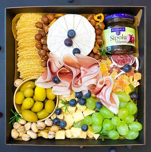 Sastāvs: vīnogas, mellenes vai dzērvenes, vītināta desa Fueta, auksti kūpināta gaļa, camembert siers, cietais siers, sīpolu džems vai brušeta (220g), sāļie krekeri, siera vafeles, krekeri olīvu, marinēti gurķi, olīvas, rieksti pistācijas, rieksti mandeles.