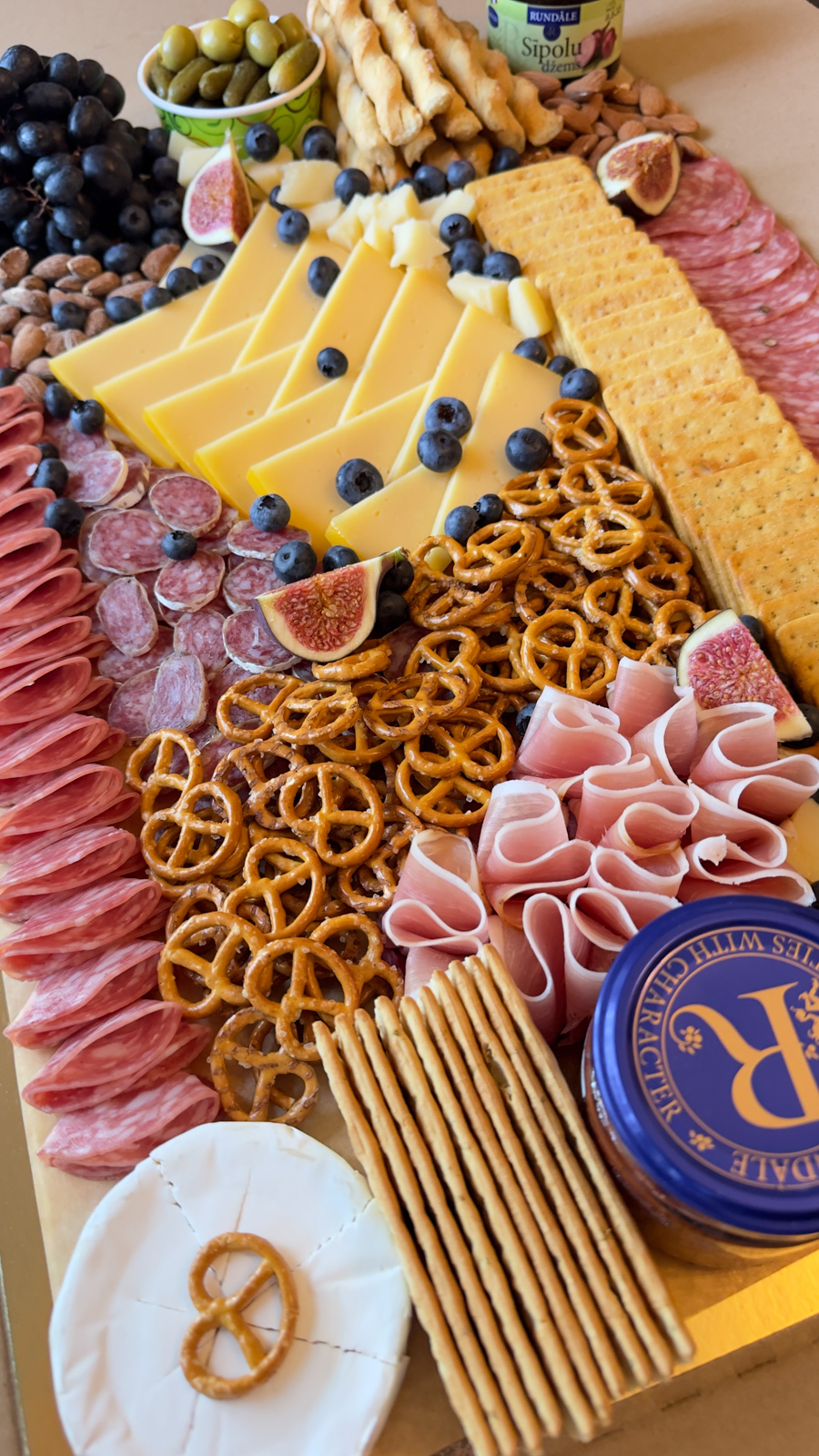Sastāvs: vīnogas, mellenes vai dzērvenes, vītināta desa Fueta, auksti kūpināta gaļa, Delux siers, salami, siera standziņas, camembert siers, cietais siers, sīpolu džems (220g), brušeta (220g), sāļie krekeri, siera vafeles, krekeri olīvu, marinēti gurķi, olīvas, rieksti pistācijas, rieksti mandeles.
